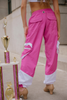 Loose fit pant with adjustable ties on the ankle to convert from a straight leg to a jogger.