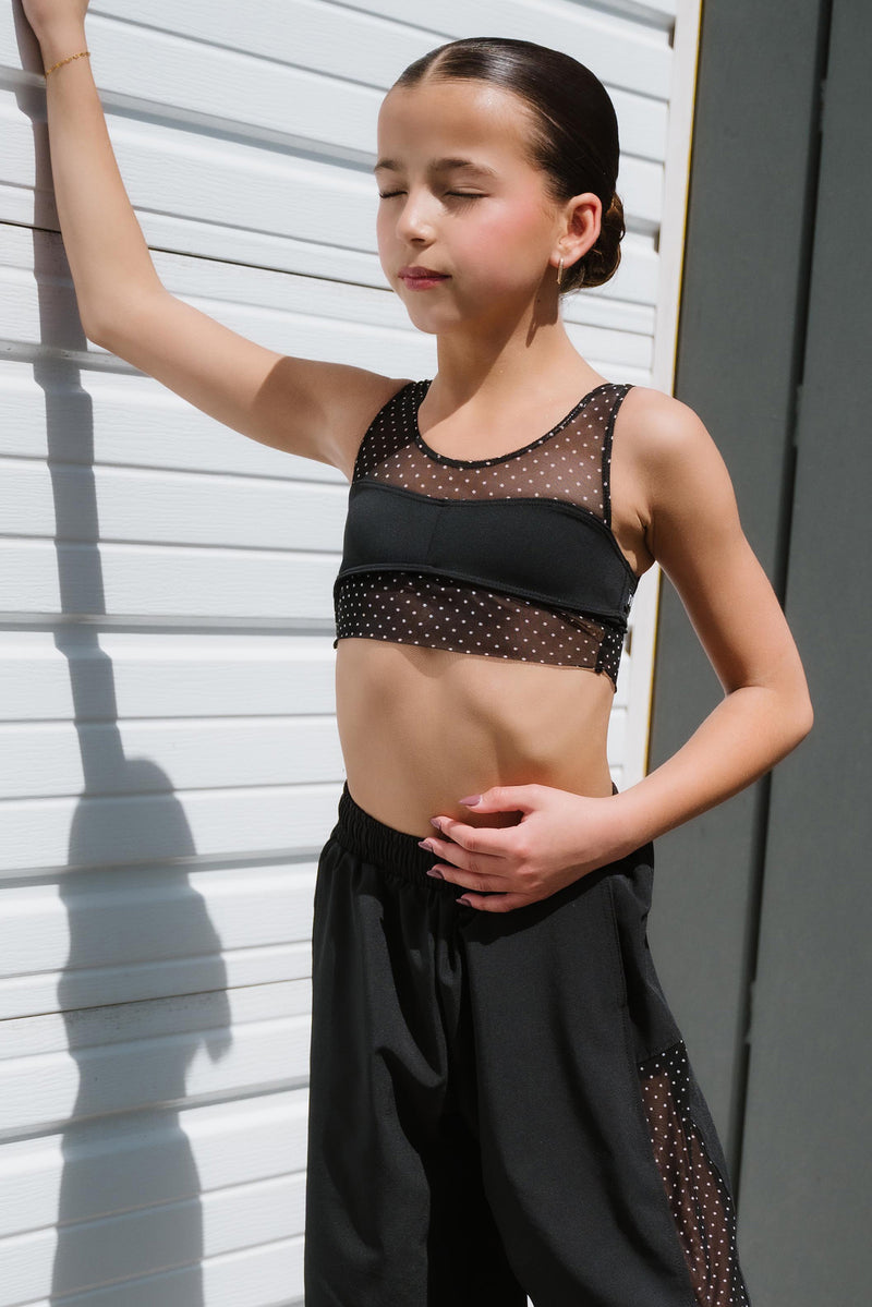 Matching polka dot mesh contrast detail