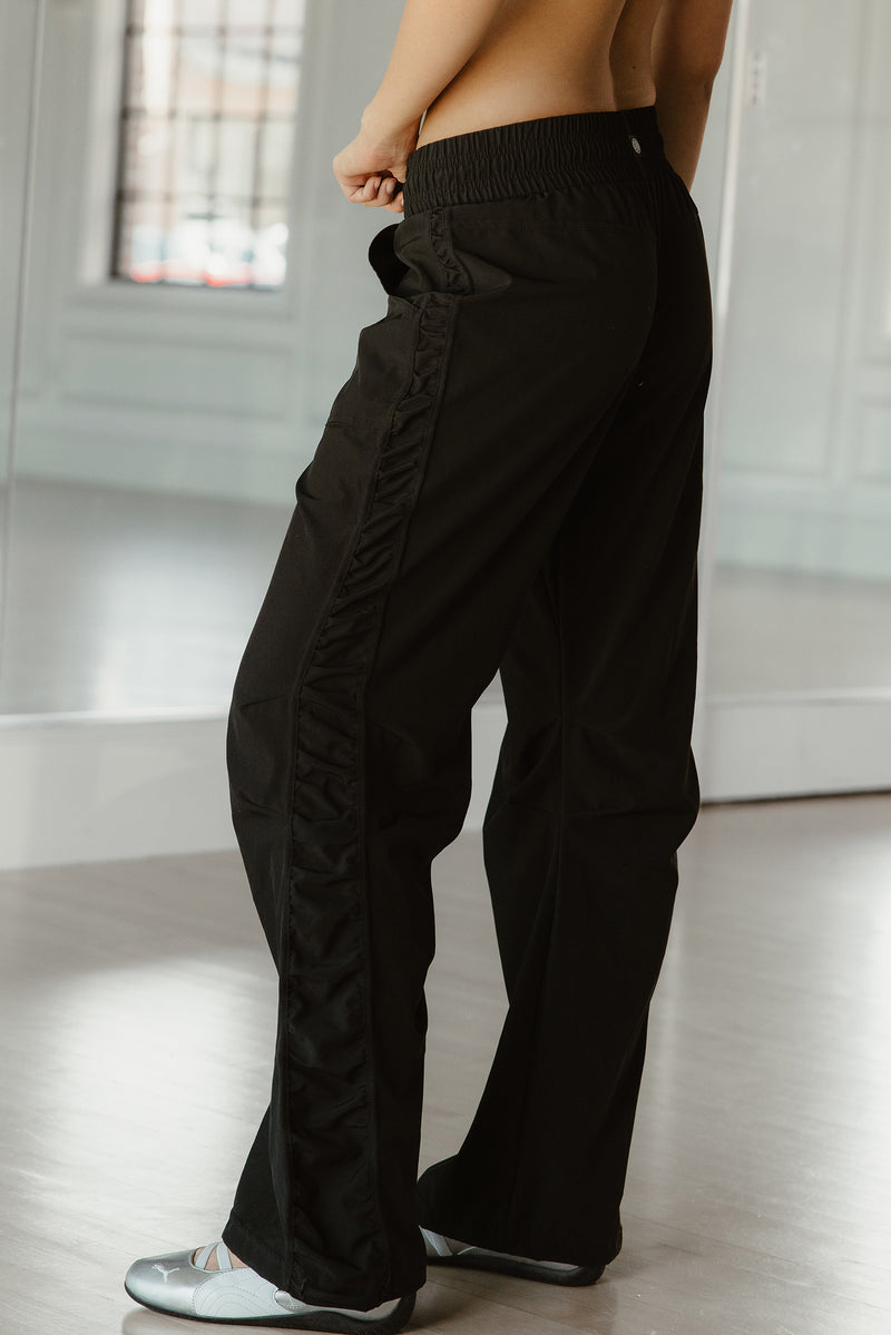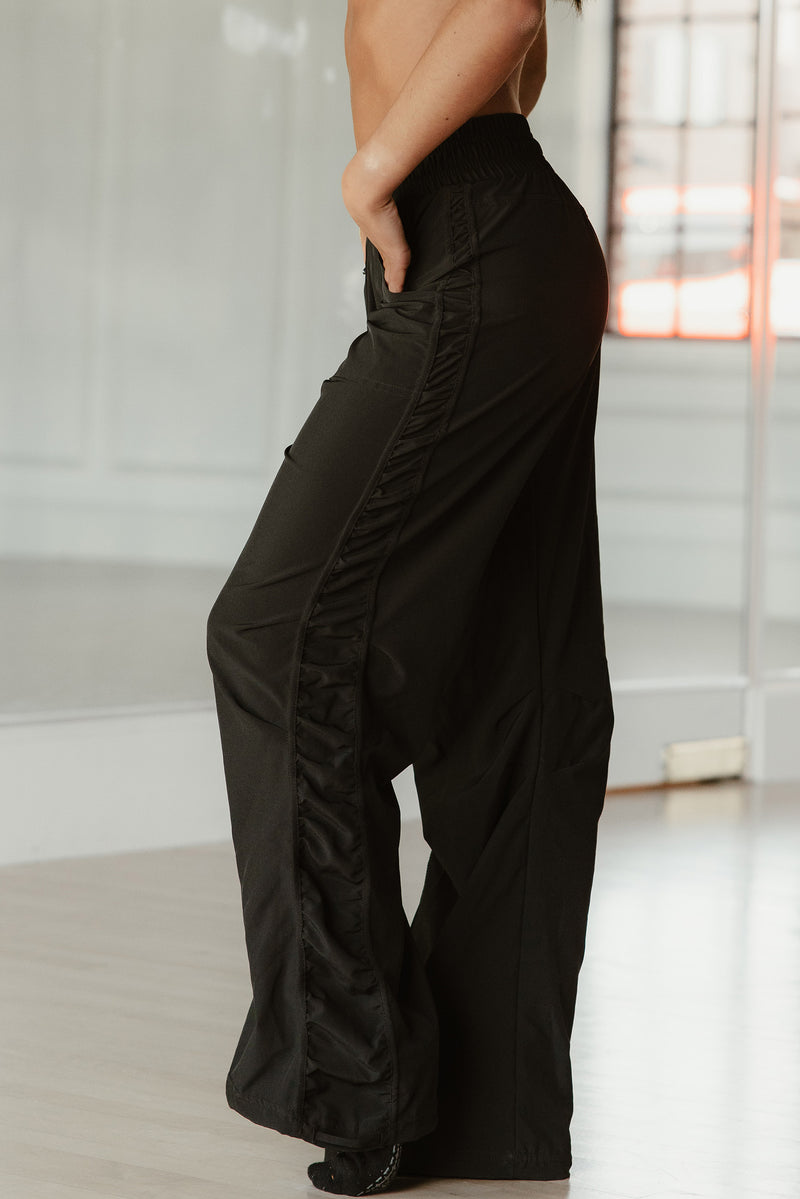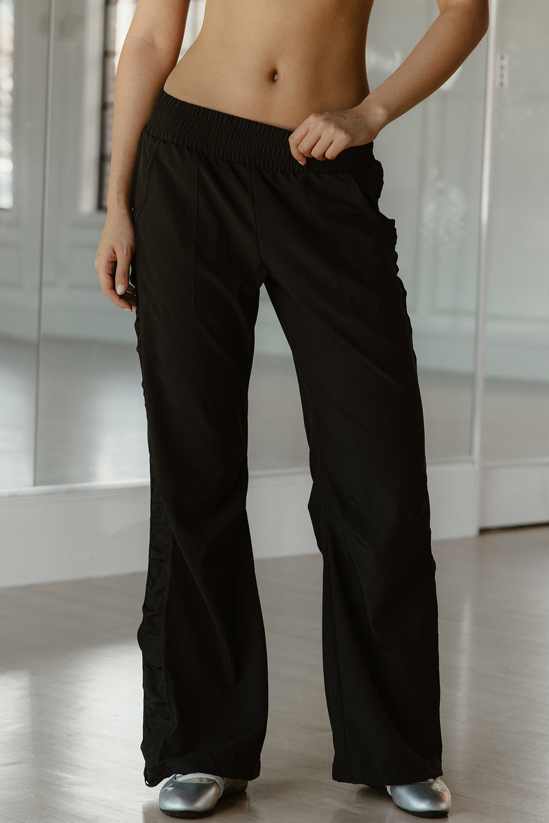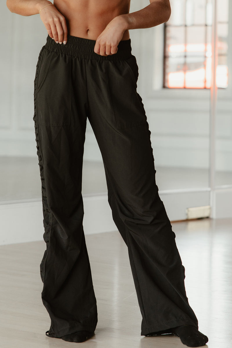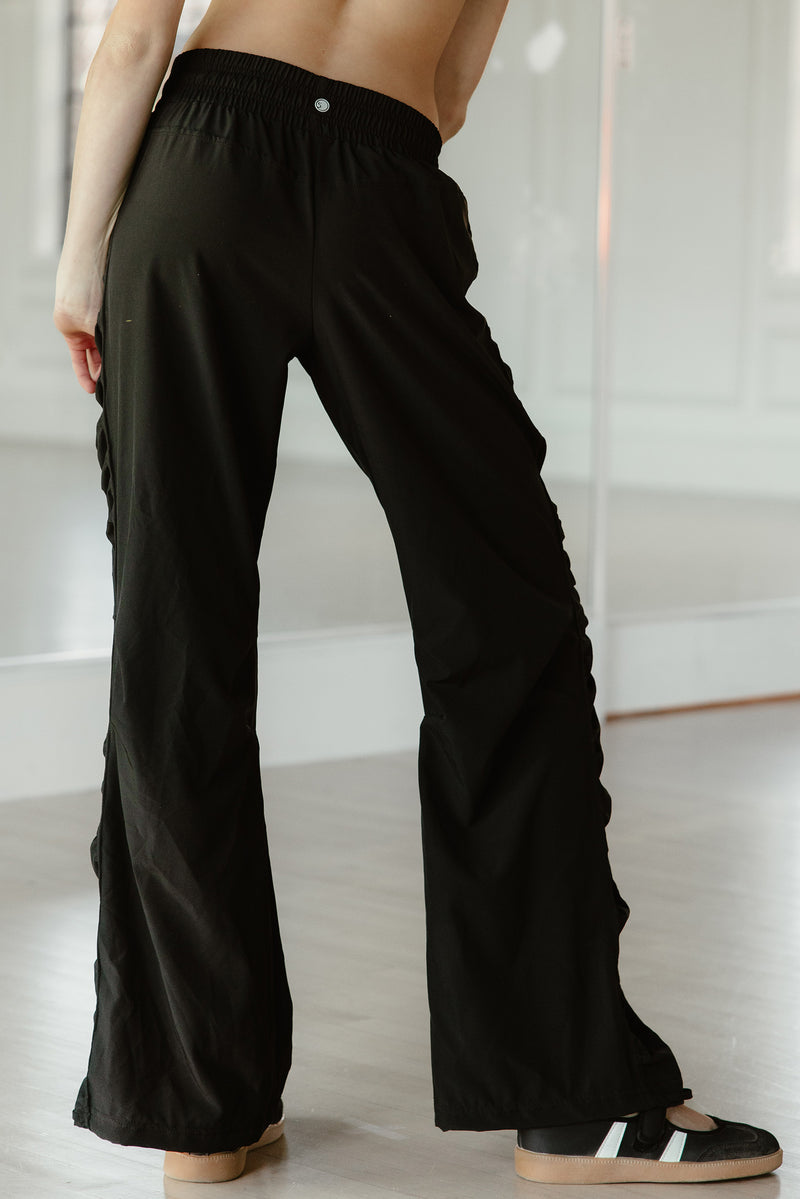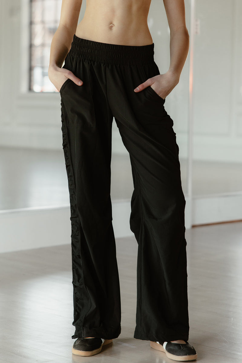 Loose fit pant with adjustable ties on the ankle to convert from a straight leg to a jogger.