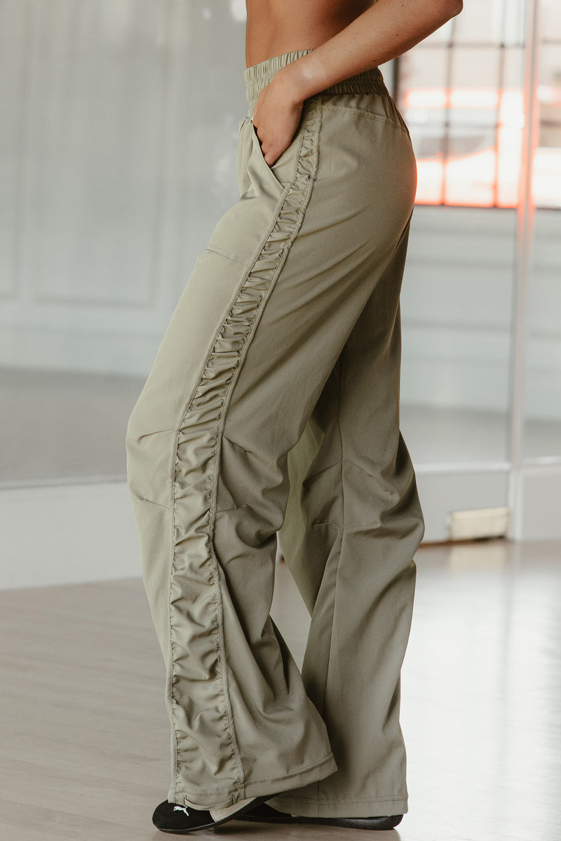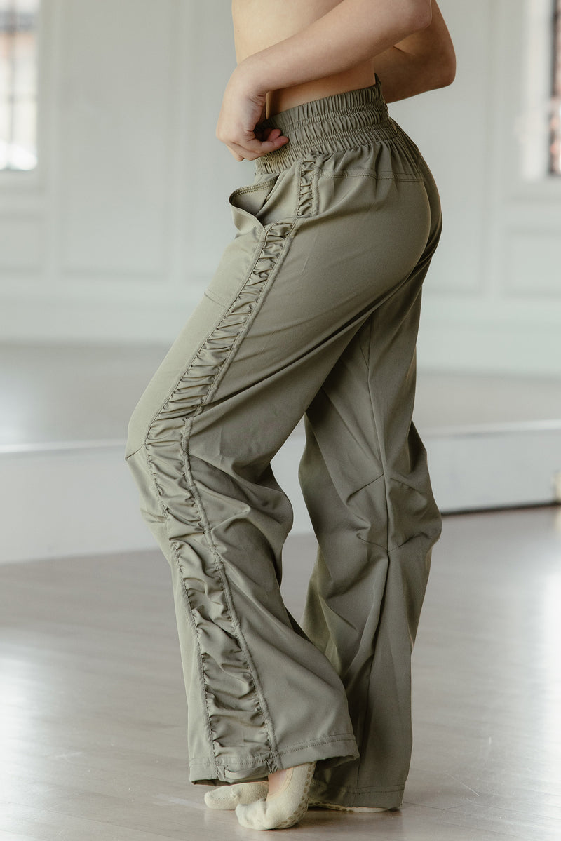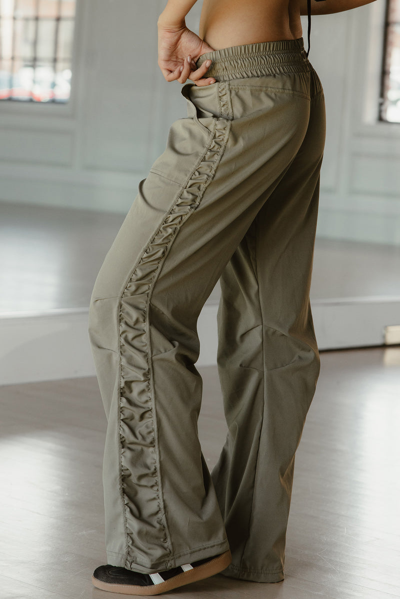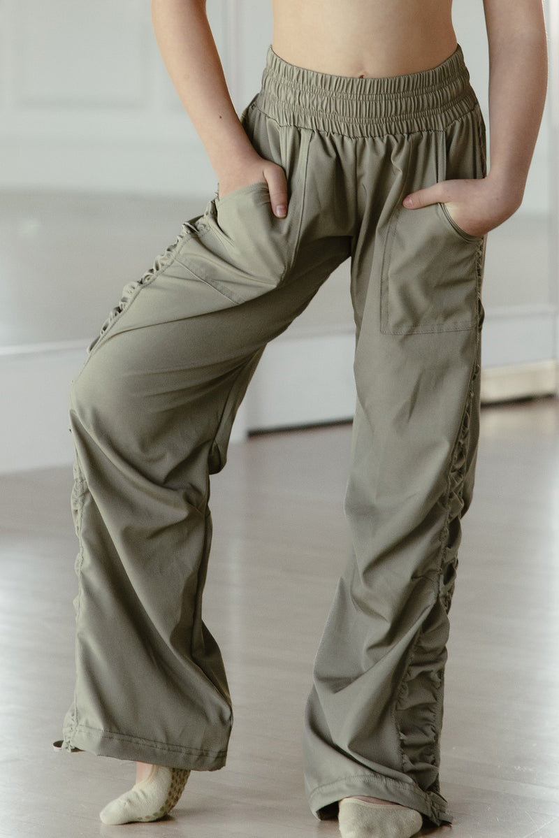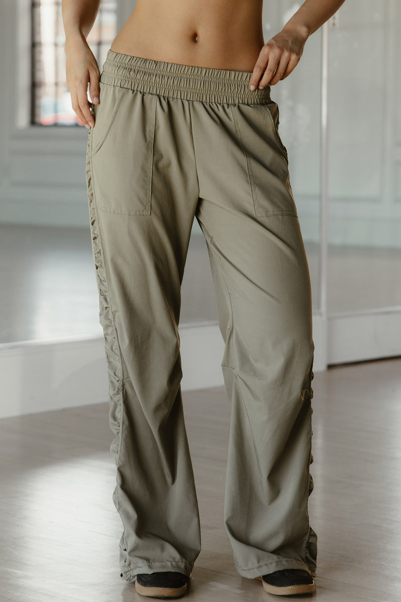 Loose fit pant with adjustable ties on the ankle to convert from a straight leg to a jogger.