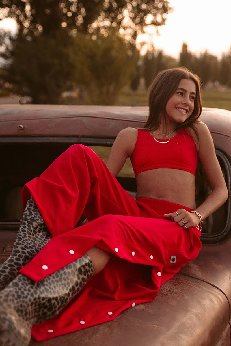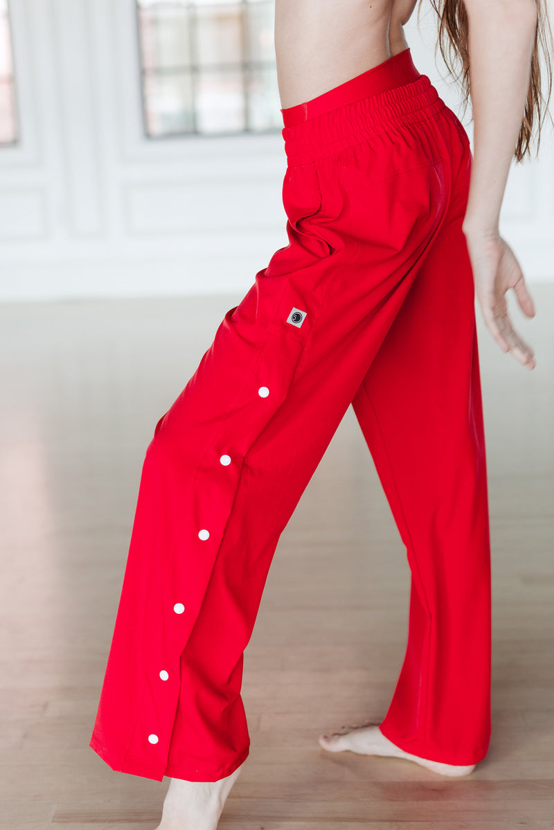Loose fit pant with snaps along the outside of the pant leg