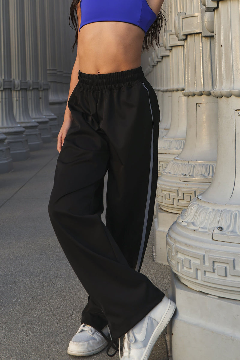 Loose fit pant with adjustable ties on the ankle to convert from a straight leg to a jogger.