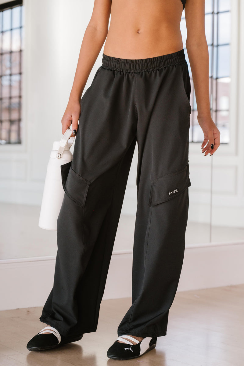 Loose fit pant with adjustable ties on the ankle to convert from a straight leg to a jogger.